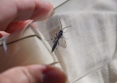 Als Highlight konnten die Teilnehmenden die Selbstgefangen Individuen an den folgenden Tagen im Kurs bestimmen. Dazu musste das erlernte Wissen aus den früheren Bestimmungstagen abgerufen werden. Welche Familie hatte eine Flügeladerung die an Ying&Yang erinnert? Und was war das auffällige Merkmal der Diapriiden? Diese und viele weitere Details konnten durch die Arbeit am Mikroskop, aber auch durch die Präparation und Kleben einiger Individuen erlernt und gefestigt werden.